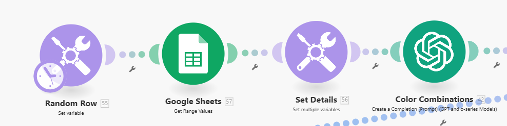 Utilizing Make.com and custom HTTP modules, we began with a single, simple API call to generate new images on a weekly basis, placing the generated images in a Dropbox folder for review by the design team. The automation eventually evolved to add color palette selection, image upscaling, and file name formatting. We also switched from utilizing Dall-e3 image generation to Midjourney image gen, as we found the later tool to be better suited to pattern-based design.