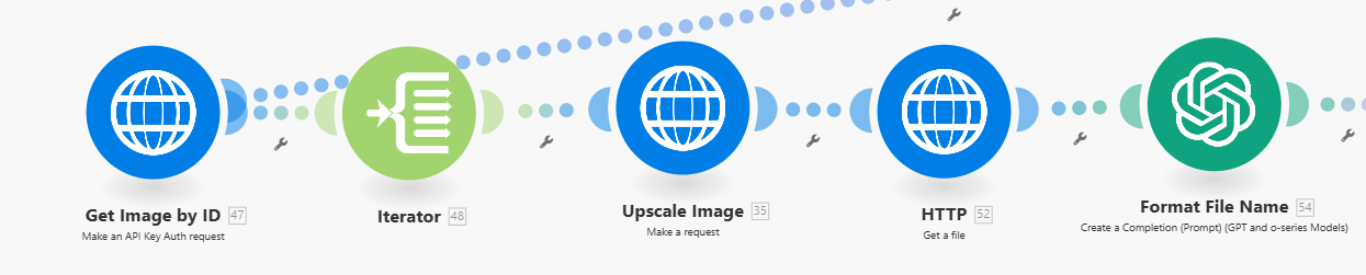 Step 4. Pull images from ImagineAPI, iterate through each image, upscale each image (using DeepAI.org), and generate a unique file name.