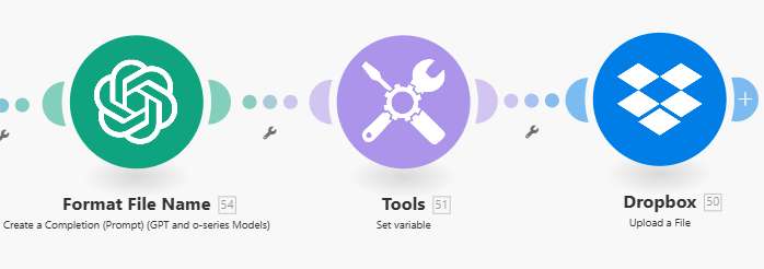 Step 5. Lastly, we normalized the file name (in the Set Variable Module), and uploaded the file to Dropbox.